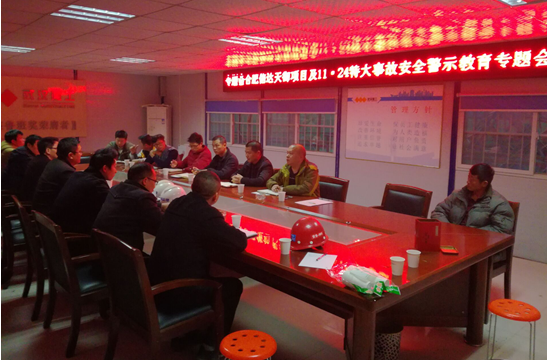 2016年11月30日,阜陽濱河花園項目部組織召開合肥信達天御及11.24特大事故安全警示教育專題會,中建五局、武漢建工項目部管理人員、安全員,合肥豐潤、浙江江南監(jiān)理部全體成員參加了會議。