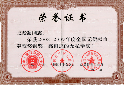 國(guó)家衛(wèi)生部、中國(guó)紅十字會(huì)總會(huì)和總后勤部衛(wèi)生部隆重召開“2008—2009年度”全國(guó)無(wú)償獻(xiàn)血表彰大會(huì),為全國(guó)共計(jì)11萬(wàn)余名獻(xiàn)血貢獻(xiàn)突出者頒發(fā)榮譽(yù)證書。我公司工會(huì)主席張志強(qiáng)榮獲“無(wú)償獻(xiàn)血奉獻(xiàn)獎(jiǎng)”銅獎(jiǎng)。