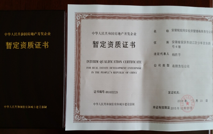 安徽皖投同安投資管理有限責(zé)任公司于2014年12月23日順利取得房地產(chǎn)開發(fā)《暫定資質(zhì)證書》。