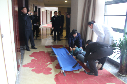下午3點,演練活動正式開始。接到樓層火災報警,客房511房間發(fā)生火災,并有人員傷亡,監(jiān)控室迅速反應,接到指令后立即啟動應急處置預案,撥打119火警報警電話及120急救電話,廣播通知人員疏散,救援人員迅速趕到指定現(xiàn)場解救被困人員。同時,聯(lián)系工程人員切斷相關電源,停運電梯,打開所有安全通道門鎖。人員成功救出后,救護人員檢查有無生命危險后立即撤退,消防安全小組使用消防器材對511房間進行滅火。人員疏散后,及時清點,確保全部撤離。