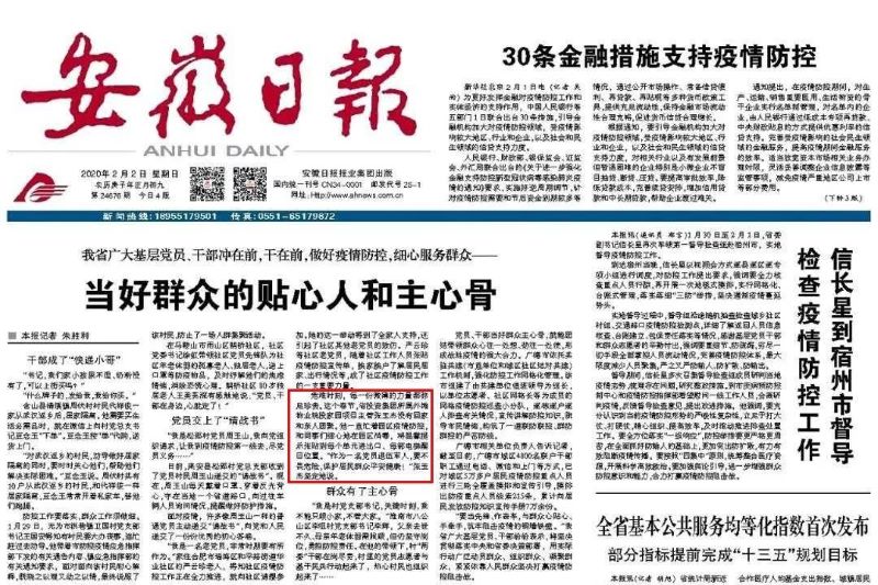 張玉杰作為一名黨員和退伍軍人,他實現(xiàn)了自己入黨時的宣言,在困難面前,勇往直前,發(fā)揮了黨員先鋒模范作用,其身體力行也深深的影響了其他同事。在各崗位默默工作的外灘物業(yè)人,也將堅守在各自的崗位上,貢獻自己一份平凡的力量,但大家都堅信偉大的祖國必將打贏這場沒有銷煙的殊戰(zhàn)“疫”。優(yōu)異的工作表現(xiàn)在安徽日報2月2日頭版《我省廣大基層黨員、干部沖在前,干在前、做在疫情防控,細心服務(wù)群眾—當(dāng)好群眾的貼心人和主心骨》中被提名表揚。