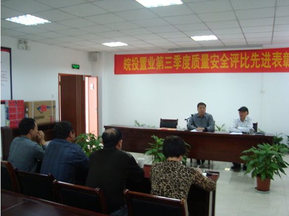 2012年10月15日下午,項(xiàng)目管理總監(jiān)丁昌華在公司會議一室主持召開了2012年三季度質(zhì)量安全評比表彰會,工程管理部,皖投置業(yè)各項(xiàng)目部、施工單位、監(jiān)理單位的項(xiàng)目負(fù)責(zé)人及相關(guān)人員參加。